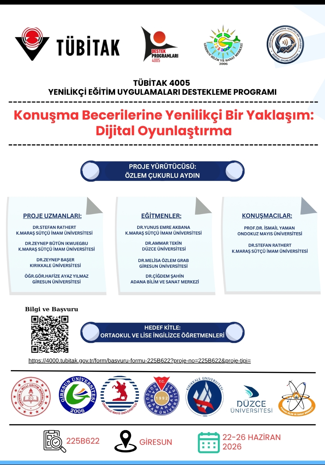 TÜBİTAK 4005 Yenilikçi Eğitim Uygulamaları Destekleme Programı kapsamında desteklenmeye hak kazanan “Konuşma Becerilerine Yenilikçi Bir Yaklaşım: Dijital Oyunlaştırma” başlıklı proje, Özlem ÇUKURLU AYDIN’ ın yürütücülüğünde Giresun Bilim ve Sanat Merkezi tarafından 22–26 Haziran 2026 tarihleri arasında Giresun’da gerçekleştirilecektir.
